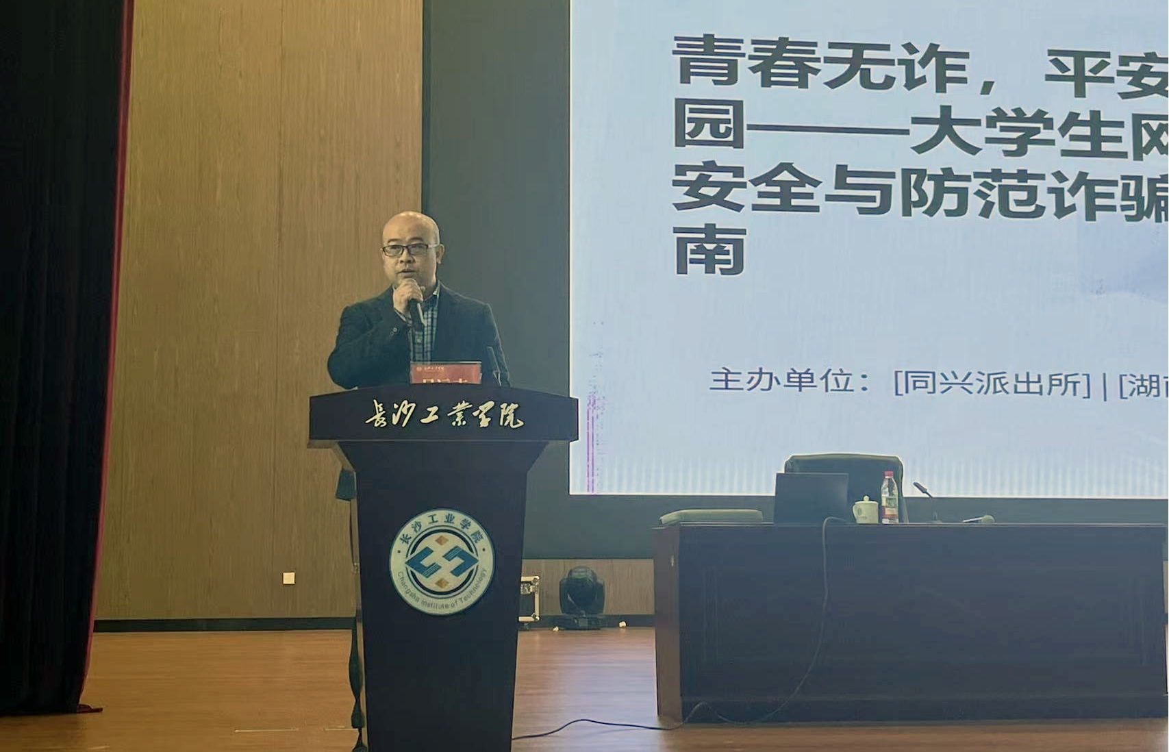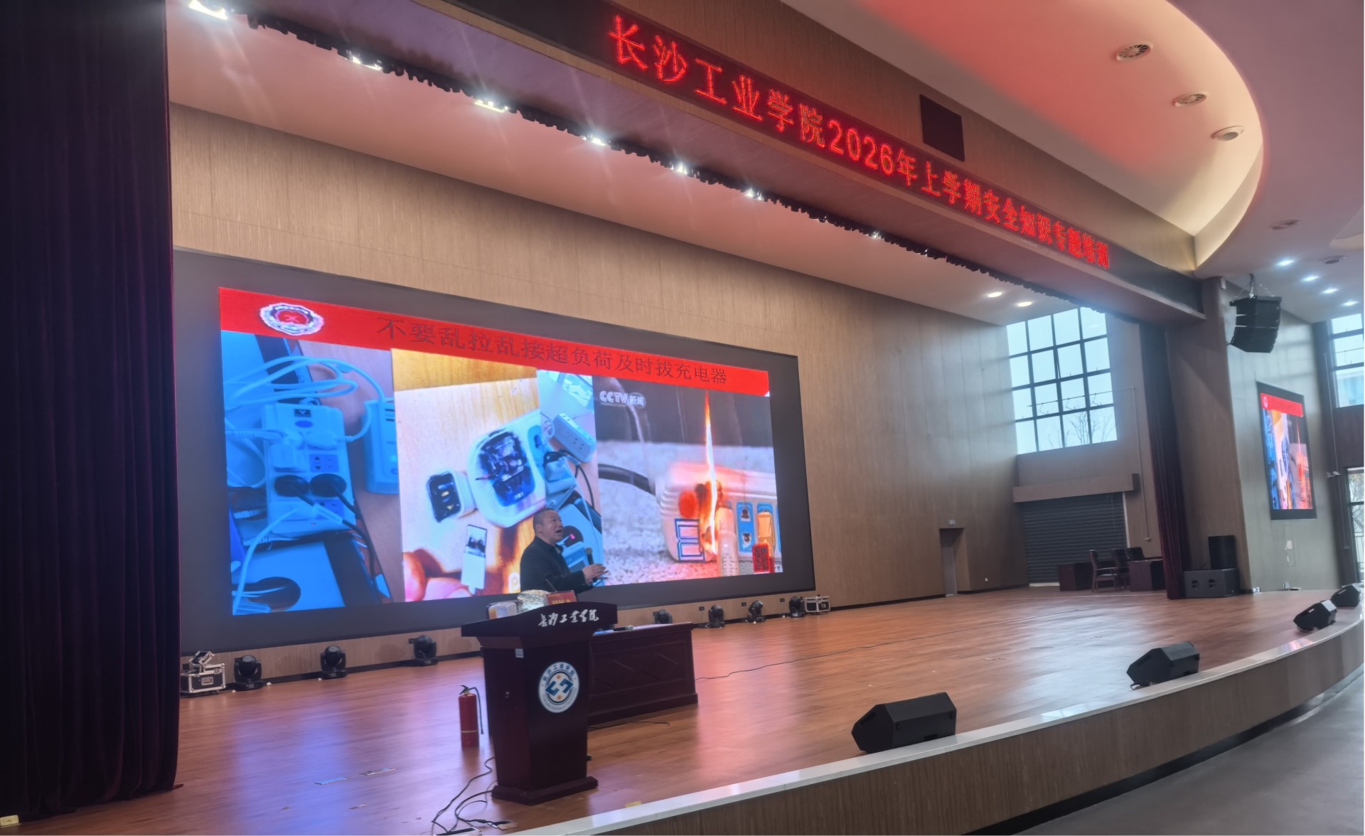 为进一步落实全省春季开学暨学校安全稳定工作视频会议精神,有效提升师生员工的安全意识与应急处置能力,3月24日,我校联合望城区同兴派出所、乌山街道司法所、湖南普消消防公司,在学校组织开展了2026年春季学期安全知识专题培训。副校长吴远志出席,各二级学院师生代表,物业人员、食堂员工、安保队员代表等900余人参训,同上“开学安全第一课”。