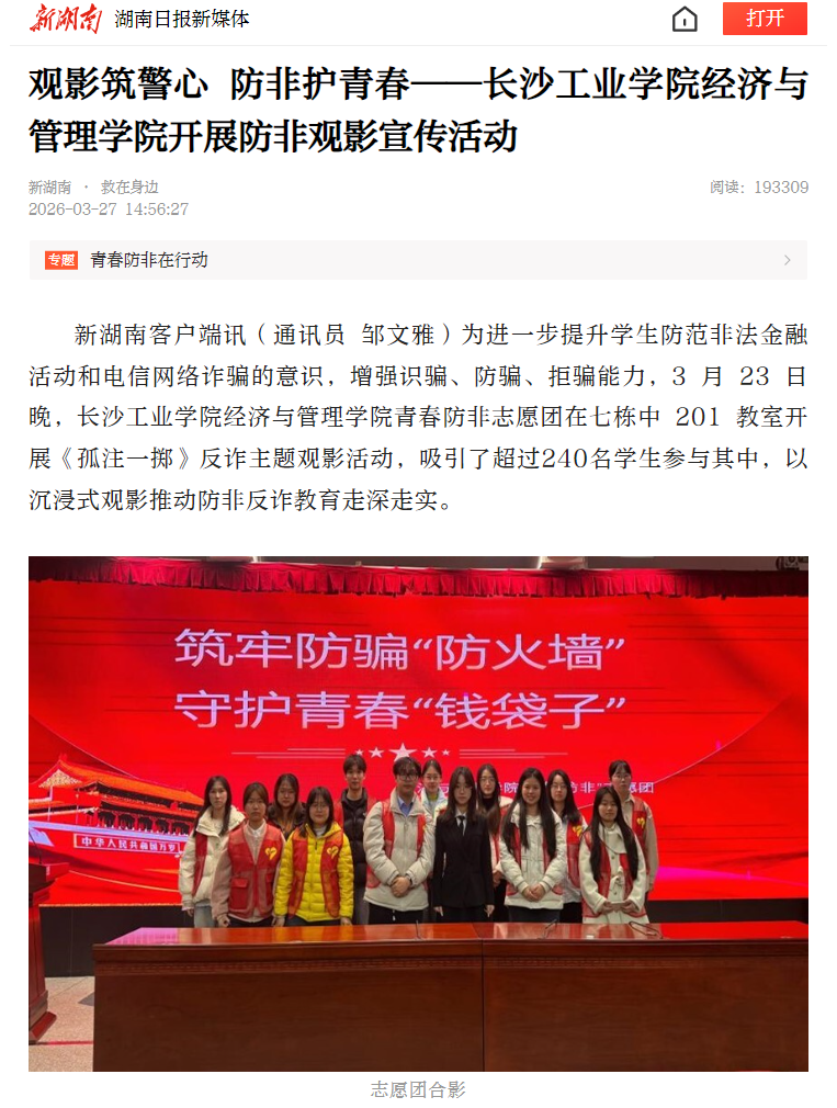 3月27日,新湖南发布:观影筑警心 防非护青春——长沙工业学院经济与管理学院开展防非观影宣传活动